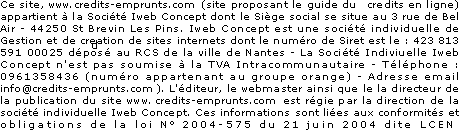 Toute représentation totale ou partielle de ce site (www.credits-emprunts.com) par quelque procédé que ce soit, sans l’autorisation expresse de l'éditeur de www.credits-emprunts.com, est interdite et constituerait une contrefaçon sanctionnée par les articles L.335-2 et suivants du Code de la propriété intellectuelle. Ce site est édité par